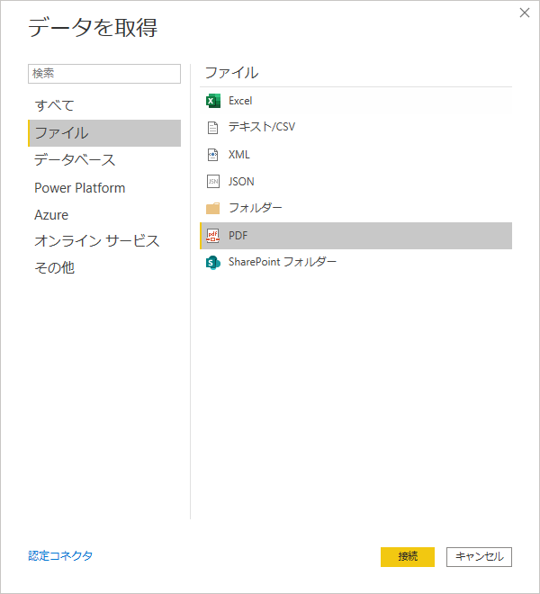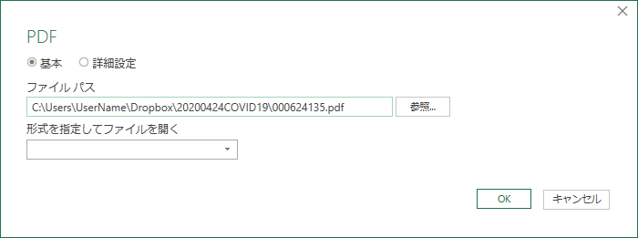 「データを取得」ウィンドウで「ファイル」から「PDF」を選ぶとファイルパスを指定するよう促される.指定して OK をクリックする.