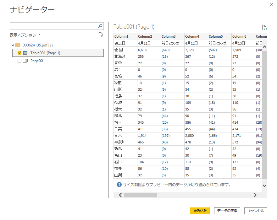 下図のようにナビゲーターウィンドウが開く.チェックボックスが 2 つあるので Table001(Page 1) にチェックを入れ,「データの変換」をクリックする.