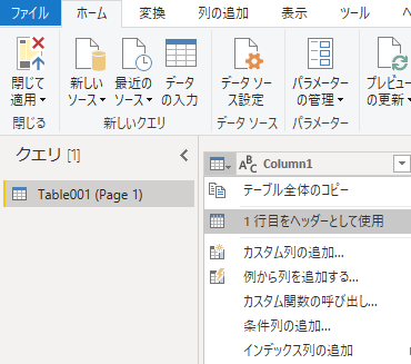 昇格されたヘッダー数 = Table.PromoteHeaders(Table001, [PromoteAllScalars=true]),