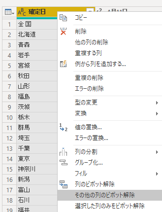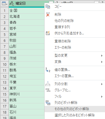 「確定日」列を選択したまま右クリックし「その他の列のピボット解除」