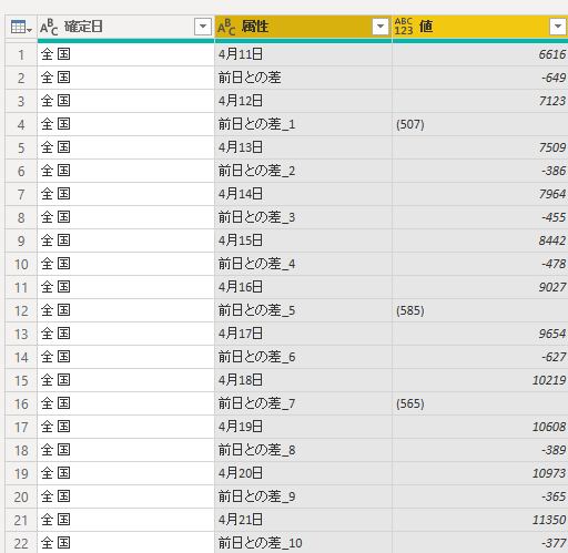 結果はこうなる.「属性」「値」という名前の列ができる.「属性」列のフィールド内に「前日との差」という値が見える.今回,これはグラフ化の邪魔になるので削除したい.