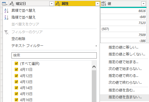 フィルターされた行 = Table.SelectRows(ピボット解除された他の列, each not Text.Contains([属性], "前日との差"))