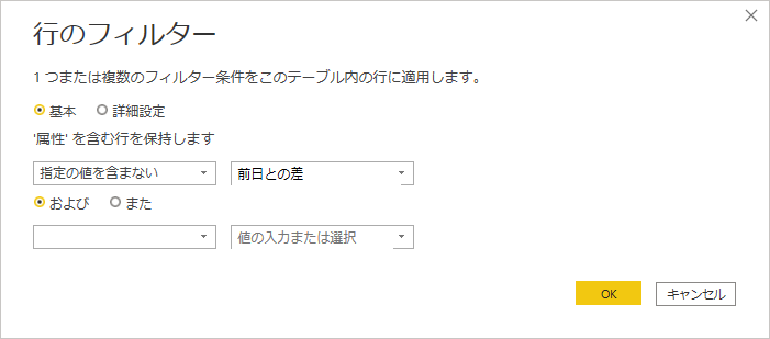 「行のフィルター」ウィンドウが開くので『前日との差』とキーボードからタイプ入力し,OK をクリックする.