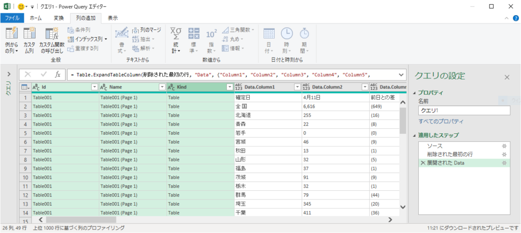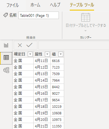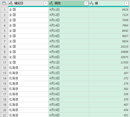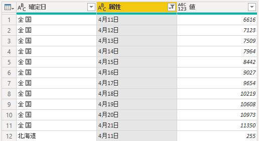 #"名前が変更された列 " = Table.RenameColumns(ピボット解除された他の列,{{"確定日", "都道府県"}, {"属性", "確定日"}, {"値", "確定患者数"}})
