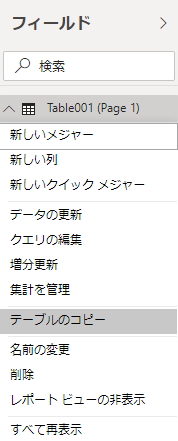 右側フィールドの中の『Table001 (Page1 )』を右クリックし「テーブルのコピー」