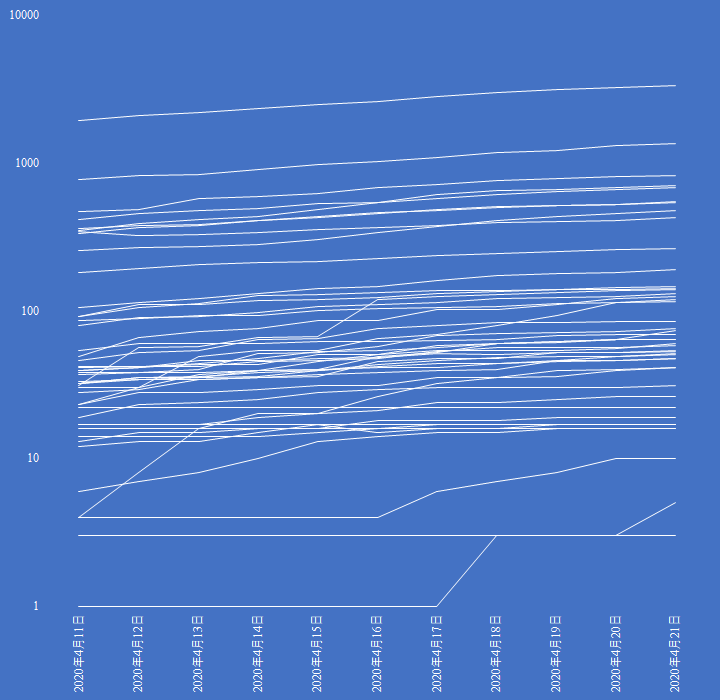 厚労省の公開した PDF ファイルを元に各都道府県のコロナウイルス確定患者数の推移を折れ線グラフに表現した.