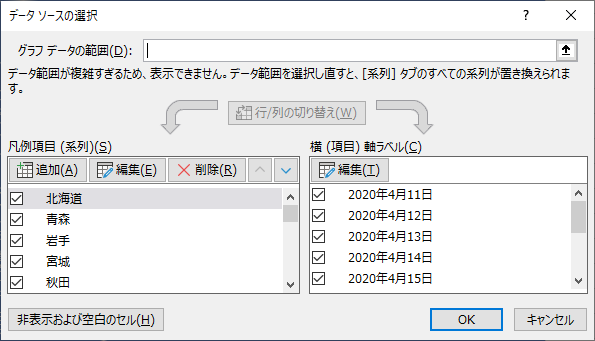 グラフ内部を右クリックして「データの選択…」を選び,系列を 47 個追加して,テーブルの各都道府県名を「系列名」に指定し,確定患者数のセル範囲を「値」に指定する.横軸ラベルの「編集」をクリックし,全国の「確定日」のセル範囲を指定する.