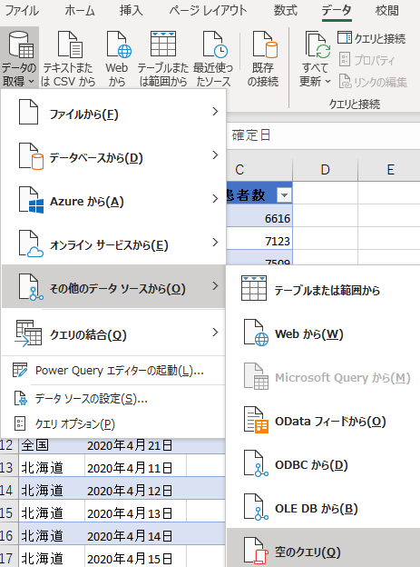 「データの取得」「その他のデータソースから」「空のクエリ」