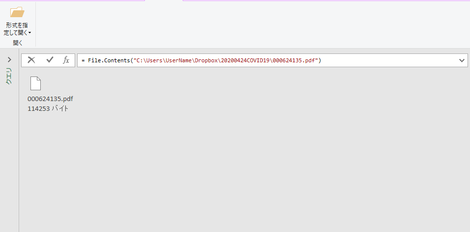 ソース = Pdf.Tables(File.Contents("C:\Users\UserName\Dropbox\20200424COVID19\000624135.pdf")),