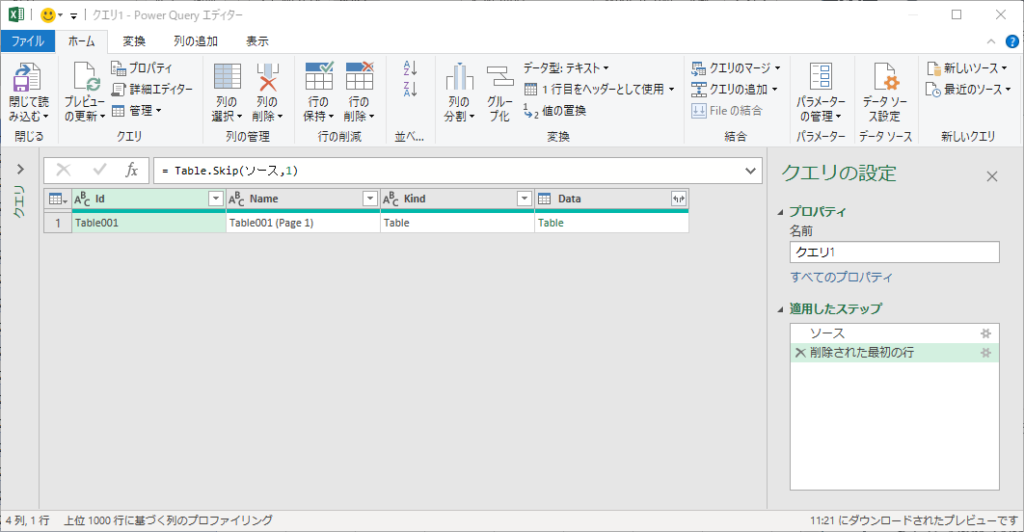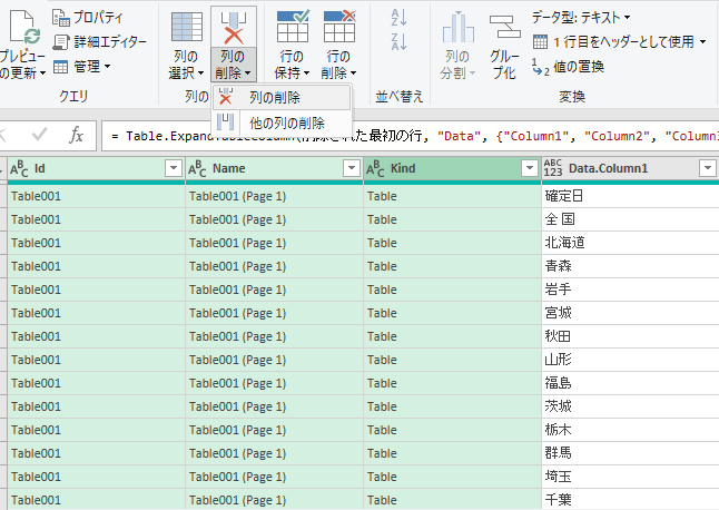 削除された列 = Table.RemoveColumns(#"展開された Data",{"Id", "Name", "Kind"}),