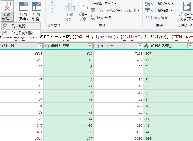 削除された列1 = Table.RemoveColumns(変更された型,{"前日との差", "前日との差_1", "前日との差_2", "前日との差_3", "前日との差_4", "前日との差_5", "前日との差_6", "前日との差_7", "前日との差_8", "前日との差_9", "前日との差_10"}),