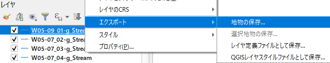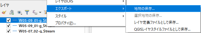 レイヤパネルに W05-09_01-g_Stream という名前のレイヤが追加されている.これは csv ファイルをデータソースとするベクタレイヤである.これをシェープファイルに変換するには,やはり「エクスポート」から「地物の保存…」と進む.