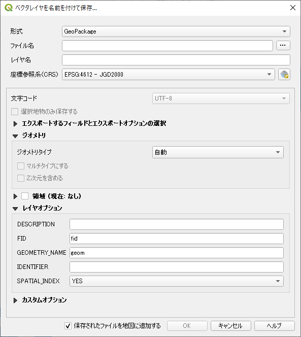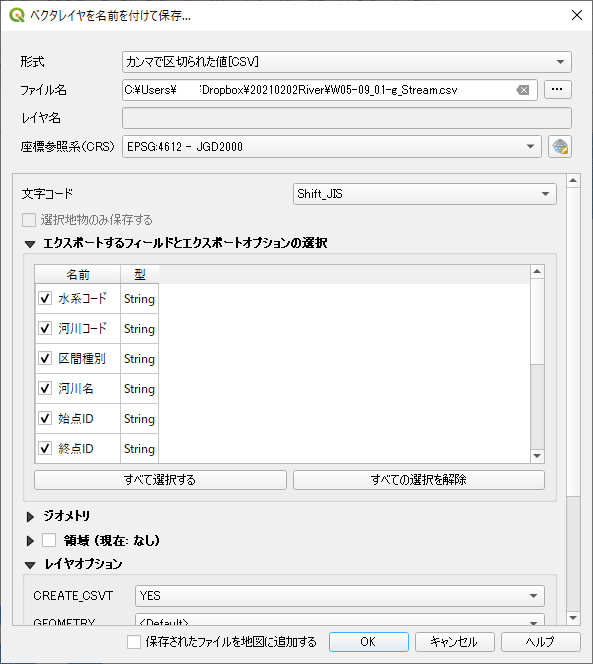 二番目,「ファイル名」にはファイルパス付きの名前を指定する.レイヤと同じ名前にしておいたほうがフォルダの中で迷子にならずに済むだろう.三番目の「座標参照系」はとりあえずそのままでいい.