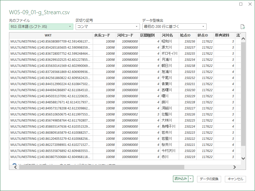 ここでおかしかったのは本来最後に来るべき流路始点 (W05-009) および流路終点 (W05-010) が河川名 (W05-004) の次に来てしまっていることである.Power Query エディタで列を入れ替える.然る後,W05-001, W05-002, …, W05-010 という具合にヘッダー名を変更する.