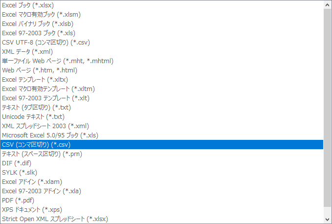 一番上にある「形式」をプレスするとファイル形式が列挙されるので,一番下の「カンマで区切られた値[CSV]」を選ぶ.