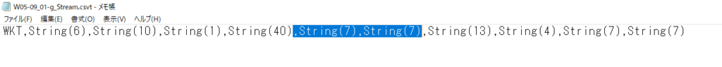 次は CSVT ファイルの編集である.メモ帳で W05-09_01-g_Stream.csvt という名前のファイルを開く.5 番目と 6 番目のデータ型定義を選択する.