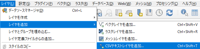 今 EXCEL で出力した csv ファイルを QGIS でレイヤに追加する.「レイヤ」メニューの「レイヤを追加」「CSVテキストレイヤを追加…」と進む.