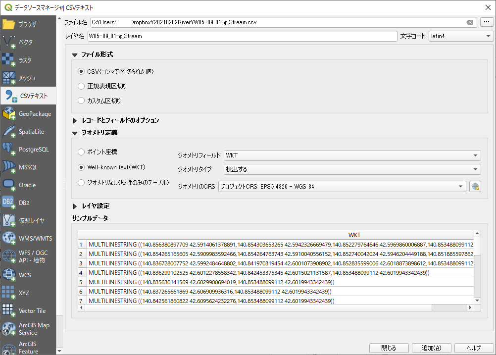 データソースマネージャが開く.「ファイル名」で」ファイルパスをユーザーインターフェースで指定する.文字コードは Shift_JIS としておく.他の選択肢は自然に決まる.