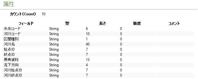 河川データの属性テーブルの構造は以下の表の通りである.詳細は製品仕様書に記載されている.