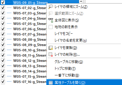 レイヤを右クリックして「属性テーブルを開く」