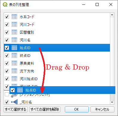 ドラッグ・アンド・ドロップで列の順序を変更できるのだが,これはレイヤの元になったファイルのフィールドの順序を入れ替えているのではなく,テーブルの見た目の順序を変更しているだけである.