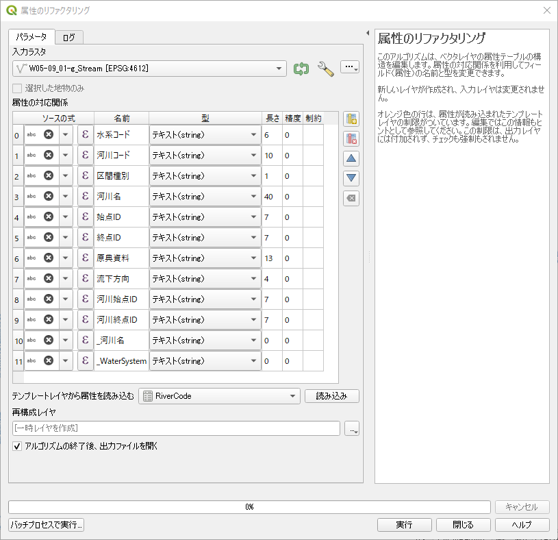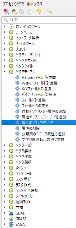 プロセシングツールボックスのベクタテーブルから属性のリファクタリングを行うことで可能となる.