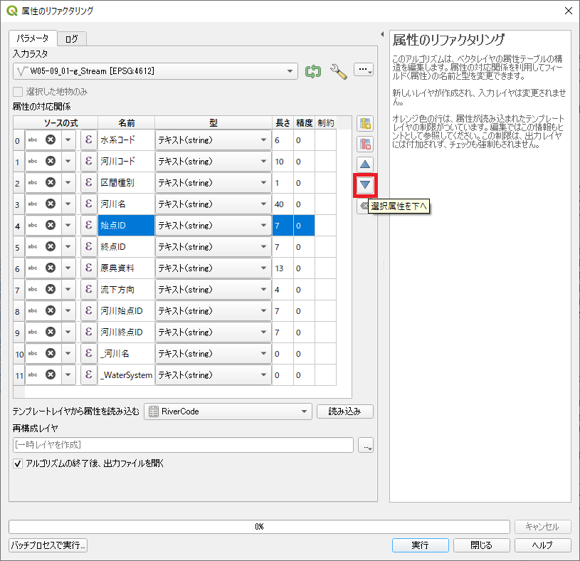 順序を入れ替えるには目的の列名をクリックして「選択属性を下へ」ボタンをクリックする.