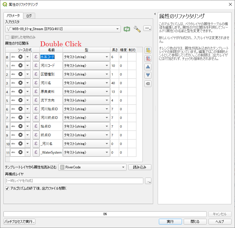 列名をダブルクリックすると編集できるようになる.河川のコード体系は W05 で始まる 7 桁の 10 個の列名である.W05_001 からはじめて W05_010 までキーボードで入力する.