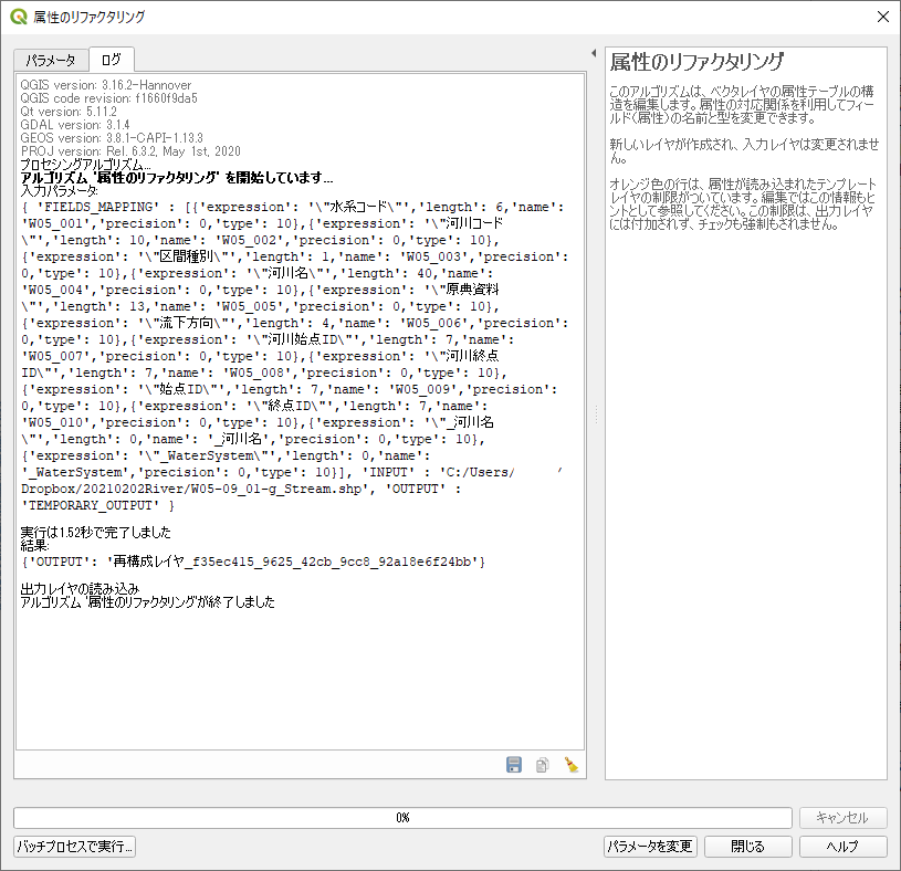 リファクタリングの結果は「再構成レイヤ」として表示される.これはメモリ上にのみ存在するレイヤであり,アプリケーションを終了すると失われるため,「エクスポート」してシェープファイルに保存する必要がある.