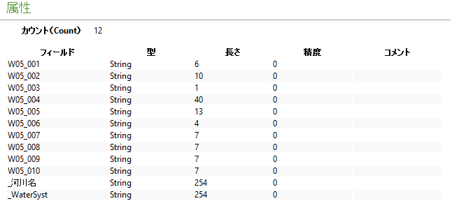 レイヤのプロパティを確認すると,編集したとおりになっている.「_河川名」と「_WaterSyst」の列名は,別項で示すが,csv ファイルを結合したテーブルのフィールドである.列名が 10 文字で切れているのは シェープファイルの仕様である.