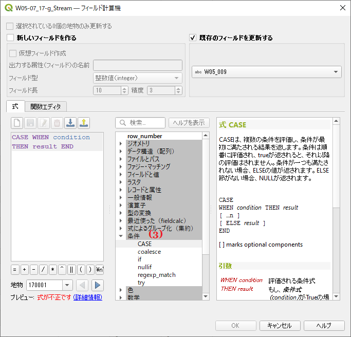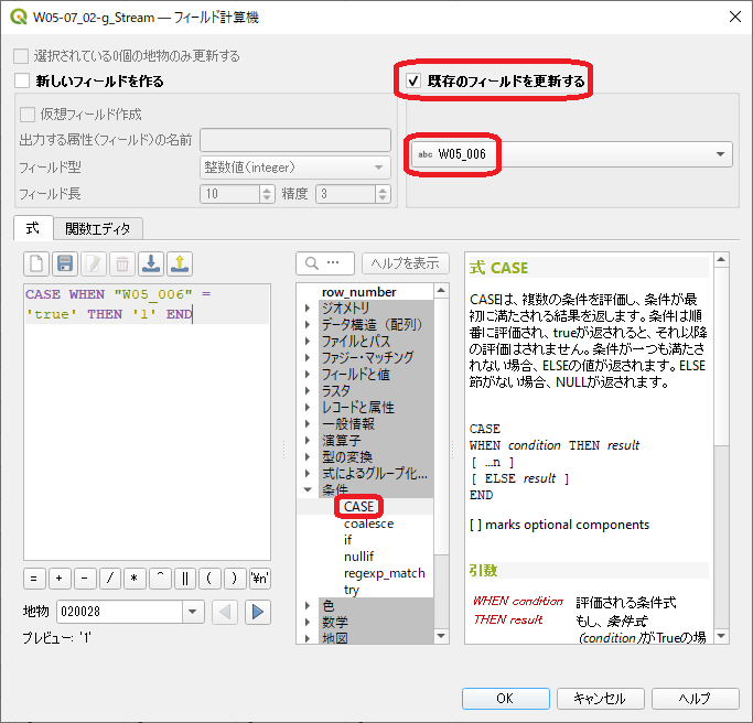 下図に示したように設定する.「既存のフィールドを更新する」にチェックを入れ,ポップアップメニューから目的とするフィールド(今回は W05_006 )を選択し,「条件」の CASE をダブルクリックすると「式」に CASE 式の概要が入るので,条件と処理をタイプして入力する.