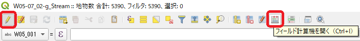 レイヤの属性テーブルを開いた状態で下図のように「編集モード切替」「フィールド計算機を開く」ボタンをクリックする.