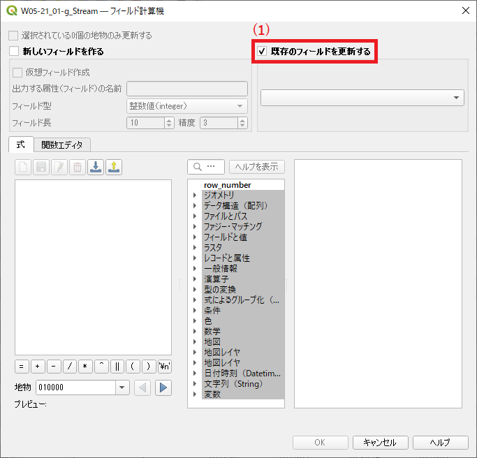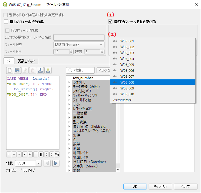 フィールド計算機で「既存のフィールドを更新する」をチェック (1) し,編集対象のフィールドを選択 (2) する.