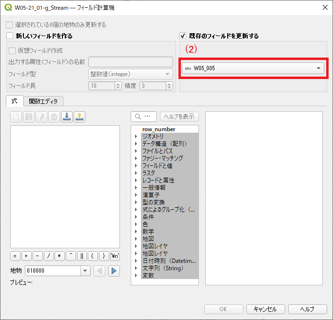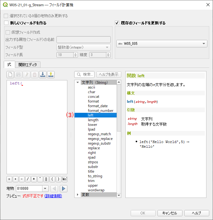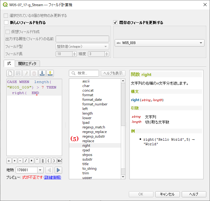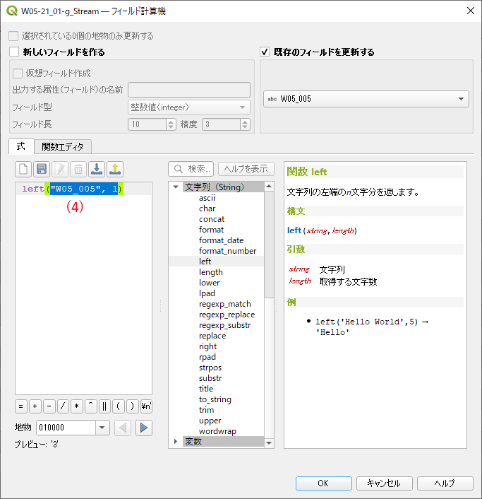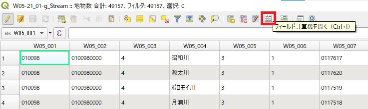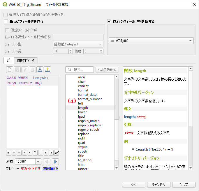 問題になっている W05_004 は河川名である.データ長の不足はテーブルの構造に関する問題であるため,フィールド計算機ではなく,属性のリファクタリングで対応すべき問題だろう.