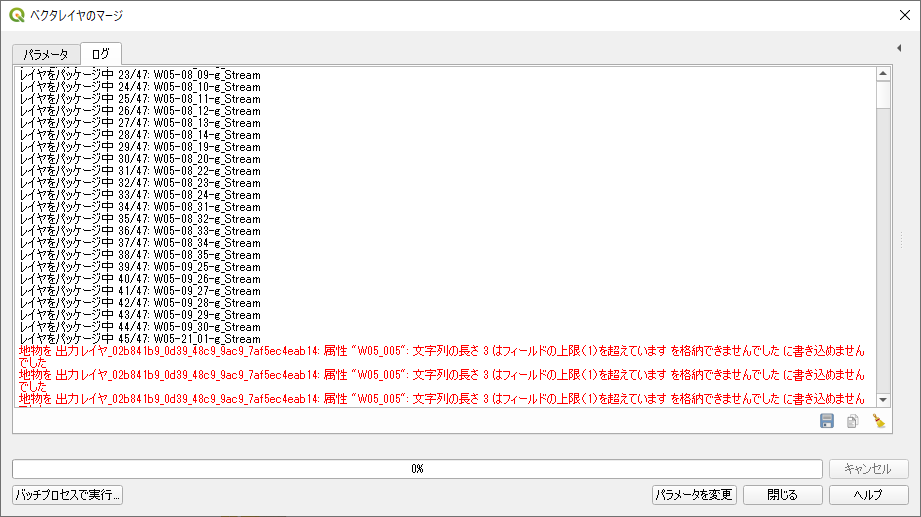地物を 出力レイヤ_42fd1a3b_9255_4991_b013_88554f1f1a3b: 属性 "W05_004": 文字列の長さ 17 はフィールドの上限(14)を超えています を格納できませんでした に書き込めませんでした