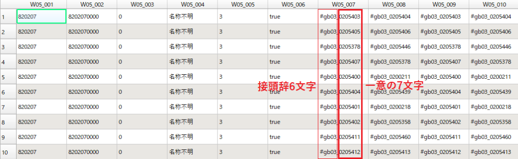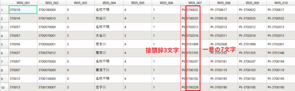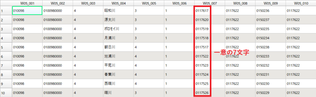 河川端点コードのデータ長は北海道が 7 桁で最短であり,四国地方が 10 桁,その他は 13 桁である.しかし,コードをよく見てみると,ユニークな値は右から 7 文字のみであることが分かる.