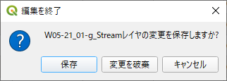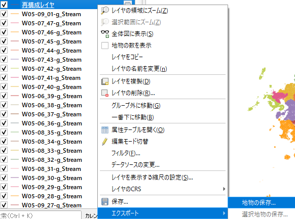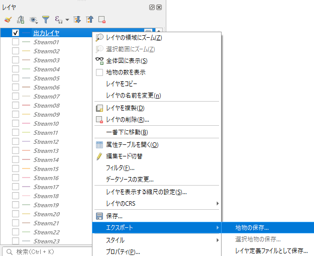 「出力レイヤ」を右クリックして「エクスポート」「地物の保存…」と進む.フルパス付きのファイル名で保存するとレイヤパネルに表示される.「出力レイヤ」は不要となるので削除する.