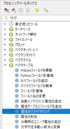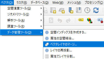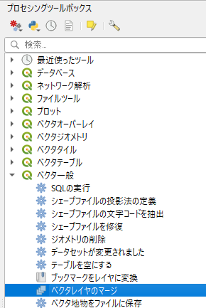 さて,ここまで来てやっと全てのレイヤをマージできる.プロセシングツールボックスの「ベクタ一般」から「ベクタレイヤのマージ」と進んでも,「ベクタ」メニューの「データ管理ツール」から「ベクタレイヤのマージ…」と進んでも良い.
