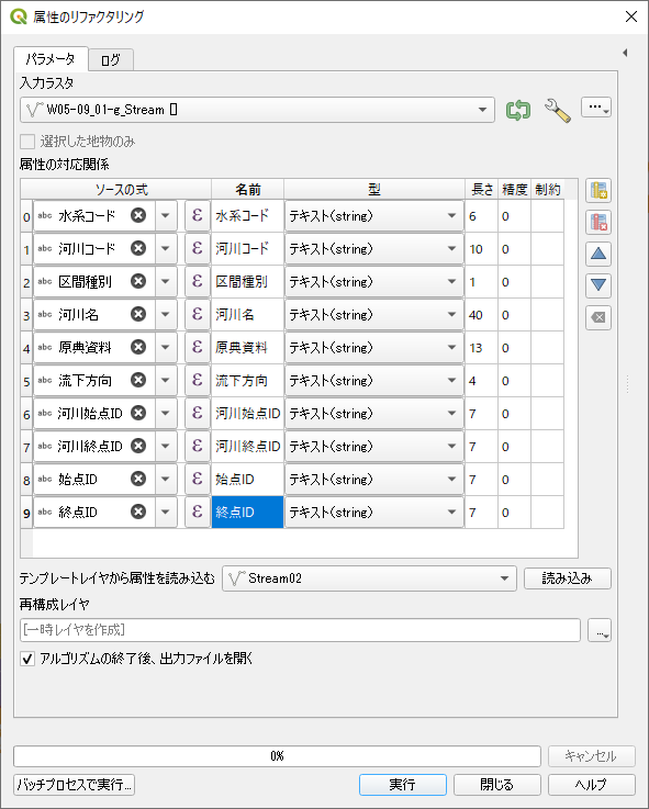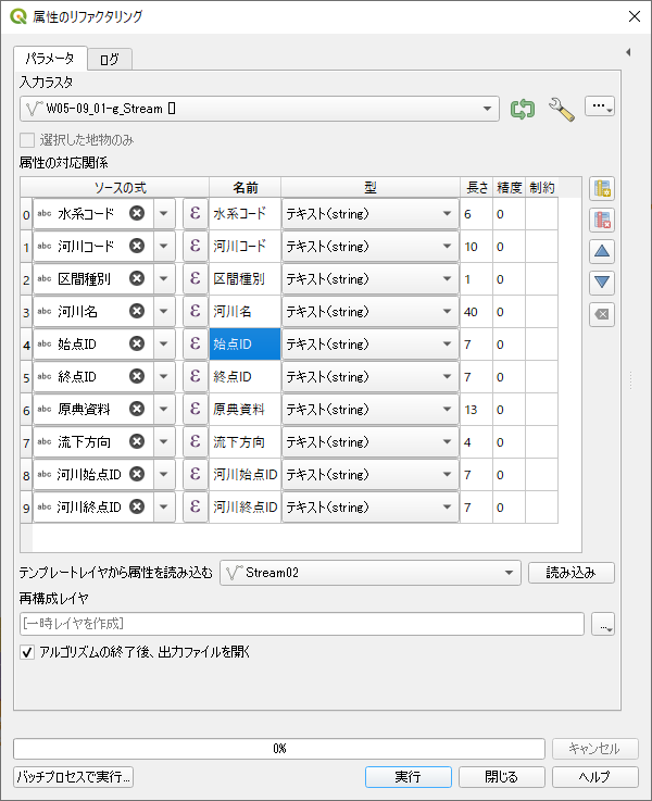国土交通省の国土数値情報の河川データを修正した.フィールド計算機による値の修正,属性のリファクタリングによるテーブル構造の修正を要した.