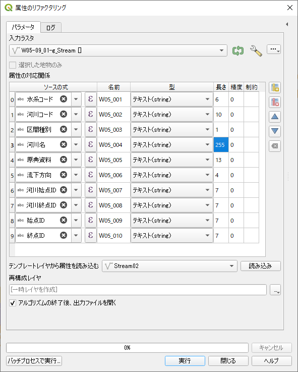 さて,国土数値情報の河川データの属性テーブルを編集してみたが…では属性テーブルのデータ長の揺れを指摘した.河川名のデータ長の最大値は 40 と見てよいだろうが,安全マージンとして 255 としておこう.