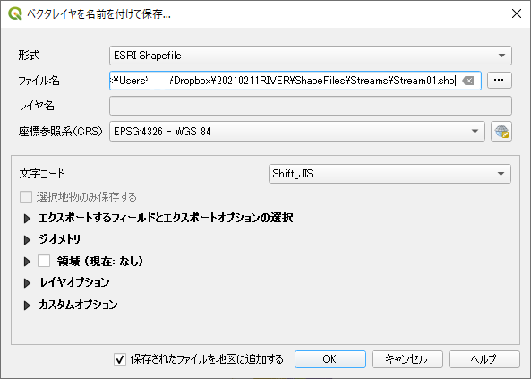 「ベクタレイヤを名前を付けて保存…」ダイアログではフルパス付きのファイル名で保存する.