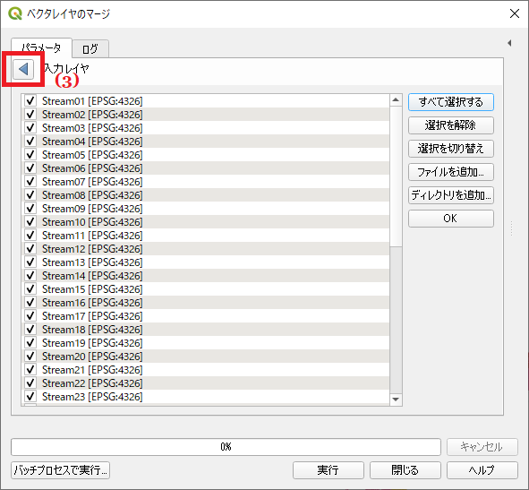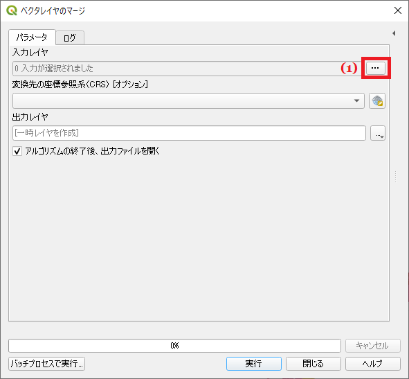 「ベクタレイヤのマージ」ダイアログが開くので,「入力レイヤ」右のボタンをクリック (1) する.