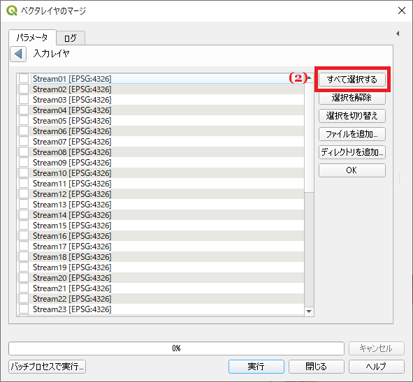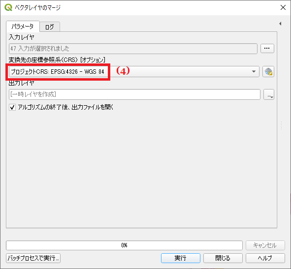 「変換先の座標参照系(CRS)」を指定 (4) する.ここは任意である.この後,「実行」ボタンをクリックすると,マージされた結果が「出力レイヤ」としてレイヤパネルに表示される.