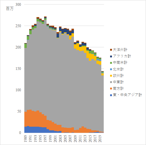 eStatから日本の資源収支を概略するでは化石燃料の一例として都市ガス販売量およびガソリン販売量の推移を見た.石油需給の推移を概観するでは原油輸入量の推移を見た.今回は1989年から2020年までの原油の輸入元の地域別,国別の推移をグラフ化した.