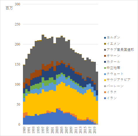 サウジアラビアとアラブ首長国連邦で大半を占める.イラクからの輸入は1991年から1996年まで停止しているが,1990年はイラクがクウェートに侵攻した年である.8月2日の侵攻を受けて国連安保理は8月6日経済制裁を決議し,イラクは1996年12月10日まで原油輸出を再開できなかった.多国籍軍がバグダッド空爆を開始したのは1991年1月17日であり,地上戦が始まったのは2月24日,2月27日にはアメリカのブッシュ大統領が勝利を宣言している.これがいわゆる湾岸戦争である.