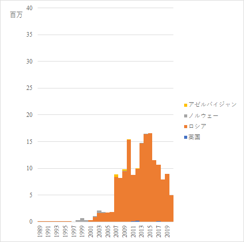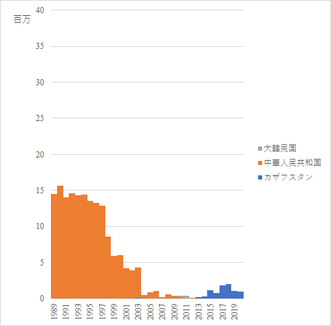 中国からの輸入はかなり多かったが,最近は輸入は途絶えている.中国自身が石油の輸入国に転じたことが大きいのだろう.