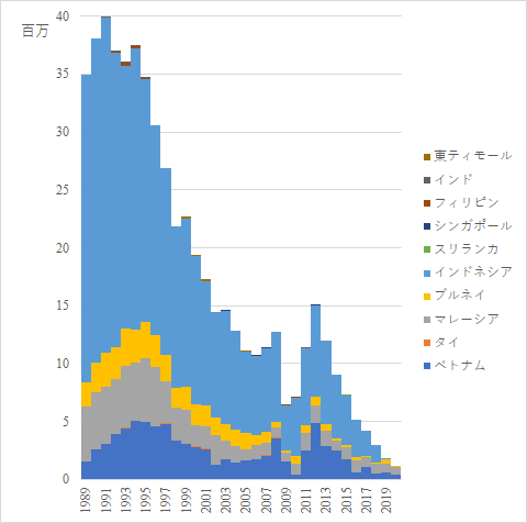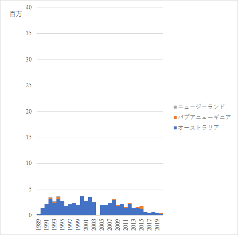 オーストラリアの存在感が大きいが,最近は減少傾向にある.2004年のデータが存在しないのは,大洋州全体の統計はあるが該当国の統計が存在しないためである.