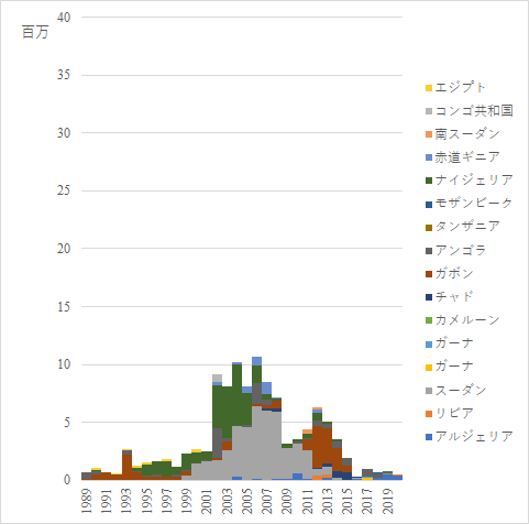 アフリカの原油輸入元は変遷が著しい.アンゴラ,ガボン,チャドあたりが安定して輸入が続いているようである.