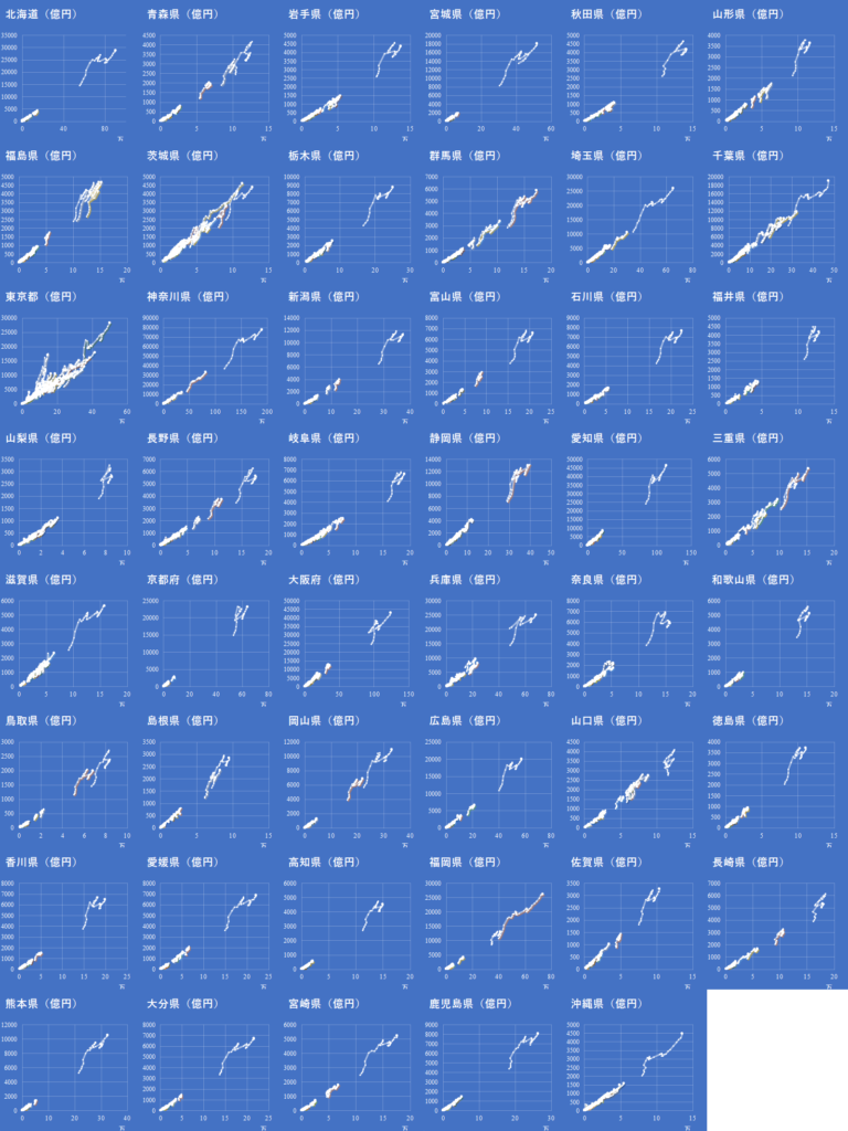 一段目のループ内で47都道府県のグラフを作成している.市区町村マスターを都道府県コードでフィルターし,残った市区町村コードを走査して地域コードを取得し,取得した地域コードでトランザクションテーブルをフィルターする.残った行が一つの市区町村の経時的データである.
