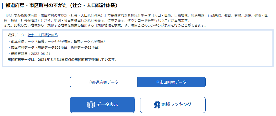 「市区町村データ」「データ表示」をクリックする.